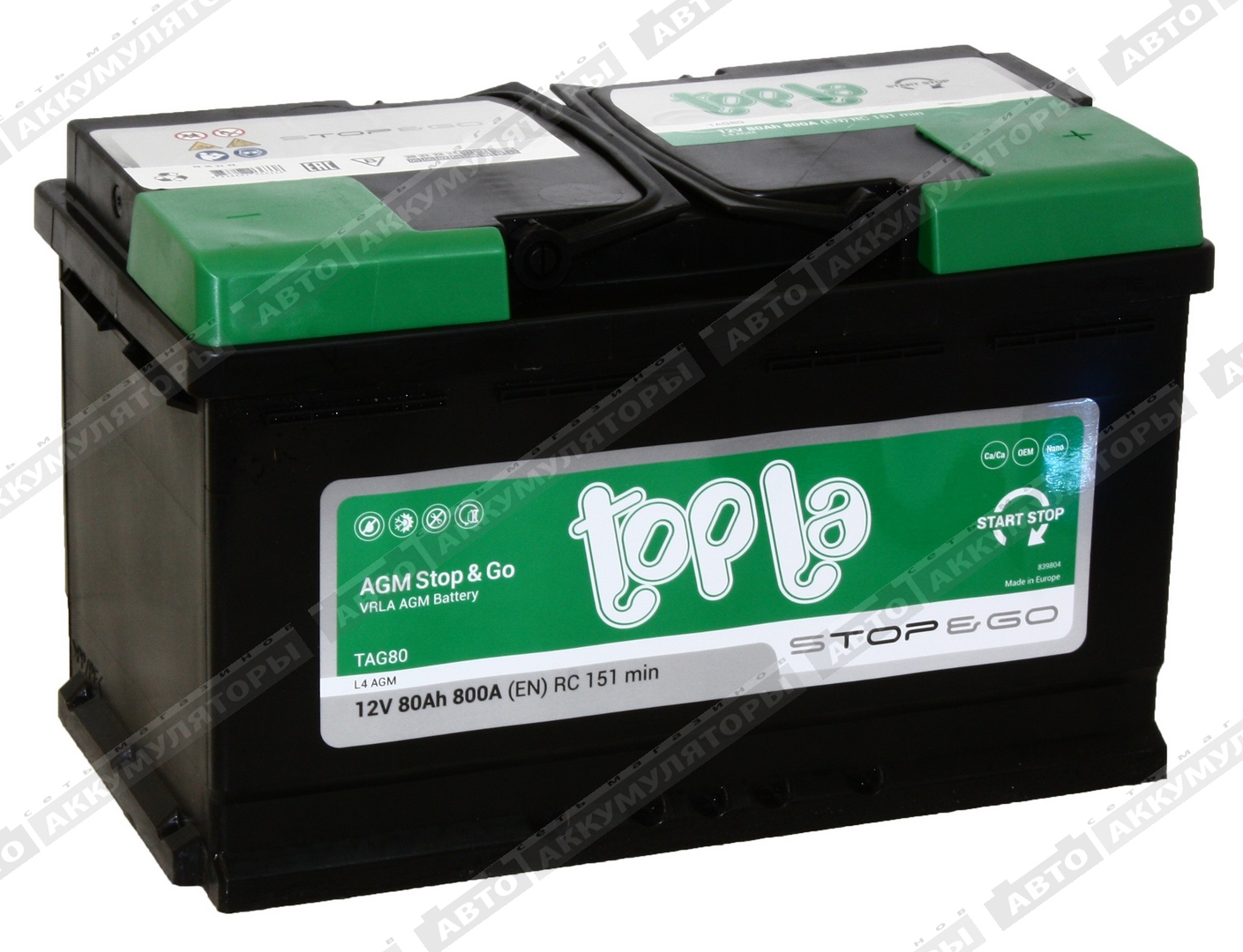 Topla AGM Stop&Go клапанно-регулируемые свинцово-кислотные батареи (VRLA), предназначены для использования в транспортных средствах с расширенной функцией СТАРТ/СТОП, где применена функция рекуперации энергии. Батарея VRLA AGM – это свинцово-кислотная улучшенная батарея с максимальной производительностью. Это герметичная батарея, созданная по технологии AGM (Absorbed Glass Material), в которой электролит абсорбирован в сепараторах из специального стекловолокна, которые гарантируют защиты от протечки электролита, даже при повреждении корпуса.