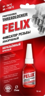 Профессиональный фиксатор резьбы Felix анаэробный неразъемный красный специально разработан для герметизации и фиксации резьбовых соединений. Представляет собой однокомпонентный анаэробный тиксотропный клей средне-высокой прочности для резьбовых соединений на основе акриловых полимеров. Отвердевает в безвоздушной среде между плотно прилегающими металлическими поверхностями и предотвращает ослабление соединений и протечку вследствие вибрации и ударов.