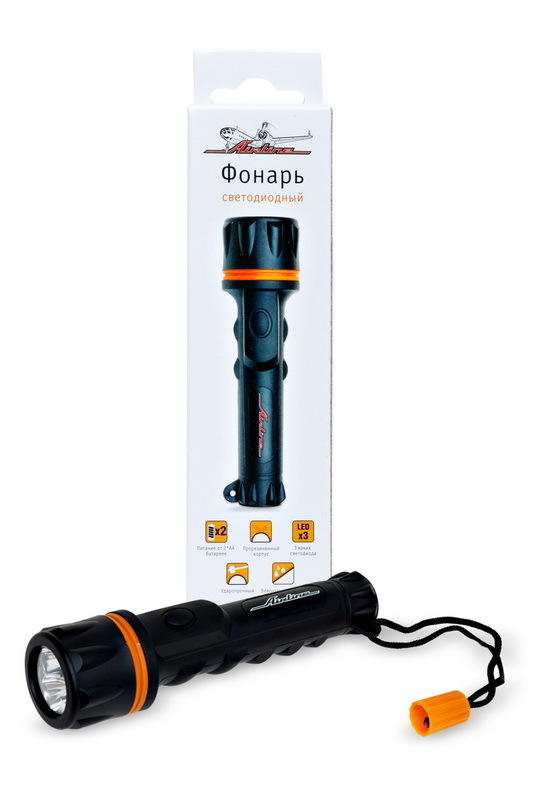 Данная модель фонарика от AIRLINE имеет не только компактные размеры, но и удобную усовершенствованную форму корпуса. Изделие имеет прорезиненную основу, а также особые выемки для пальцев в области рукоятки, увеличивающие комфорт при эксплуатации изделия. Фонарик работает на основе 2-х батареек категории АА. Питание батареек дает возможность беспрерывно функционировать устройству на протяжении 48 часов.